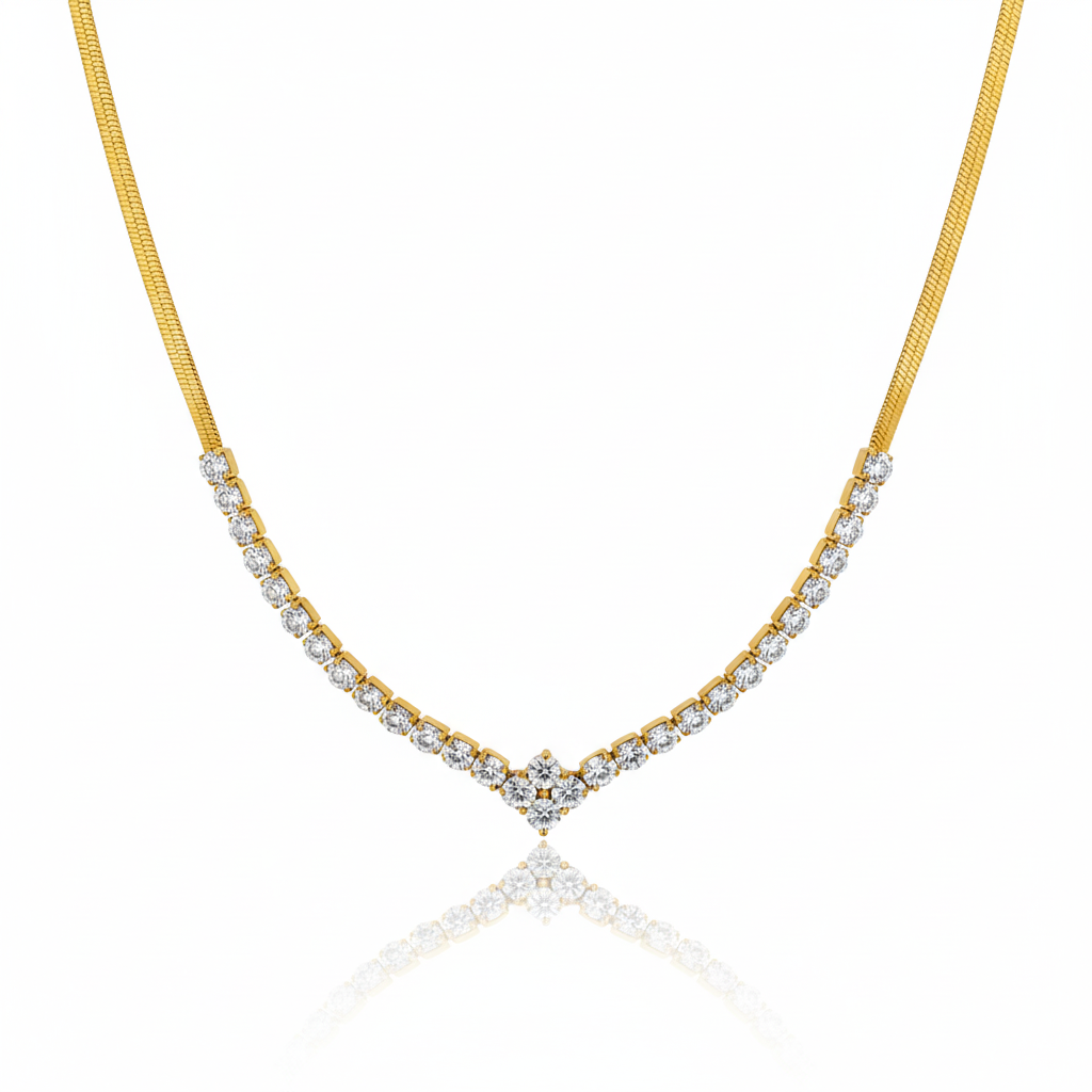 Made from high-quality gold-plated metal, this women’s gold necklace features a sleek snake-style chain and a graceful V-shaped pendant adorned with brilliant cubic zirconia stones, hand-set to capture and reflect light from every angle.