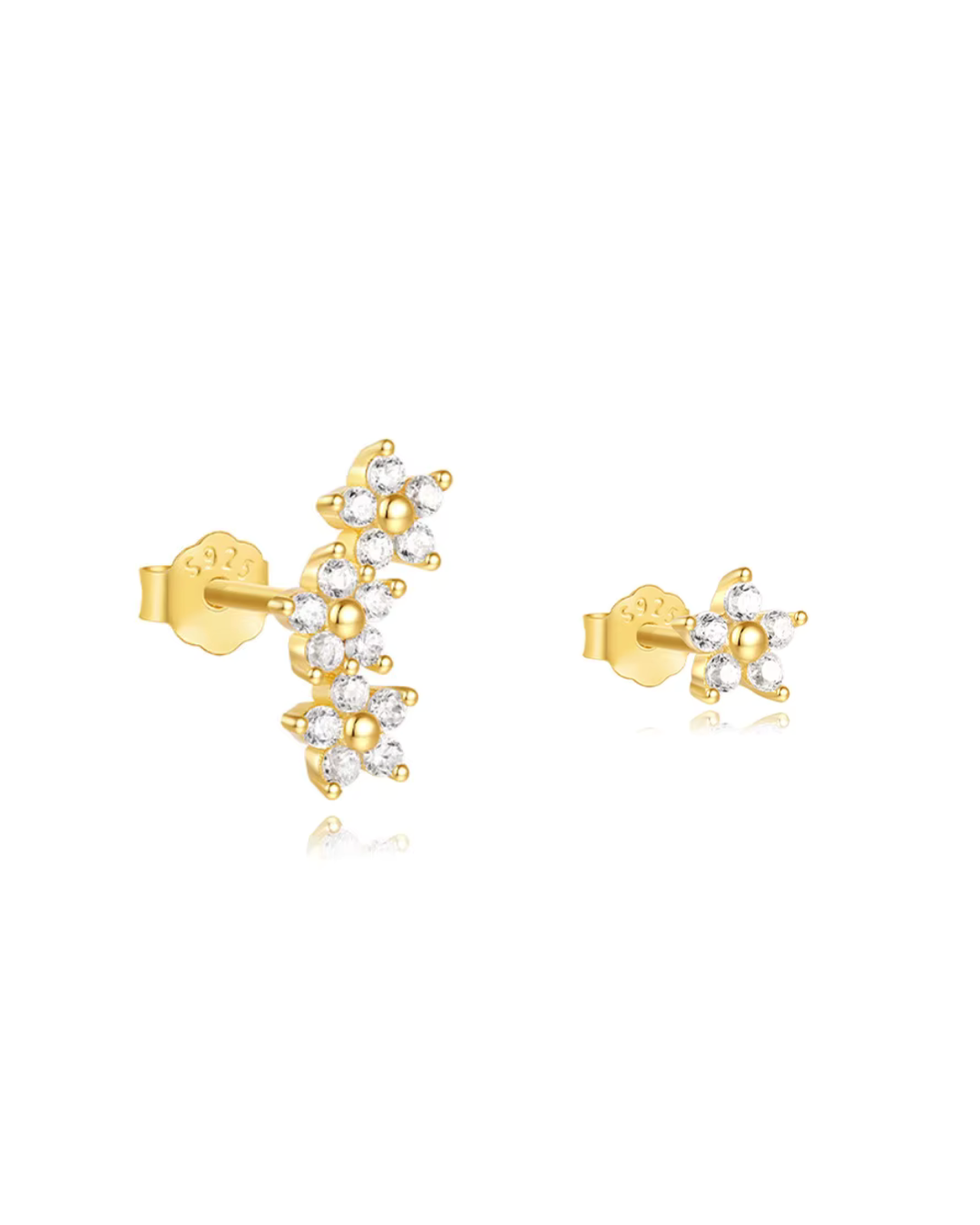 Crafted from high-quality gold-plated metal, these earrings feature a charming asymmetric design: one ear adorned with a cascading trio of floral cubic zirconia clusters, and the other with a single sparkling bloom. The result is a look that feels playful, modern, and gracefully refined.