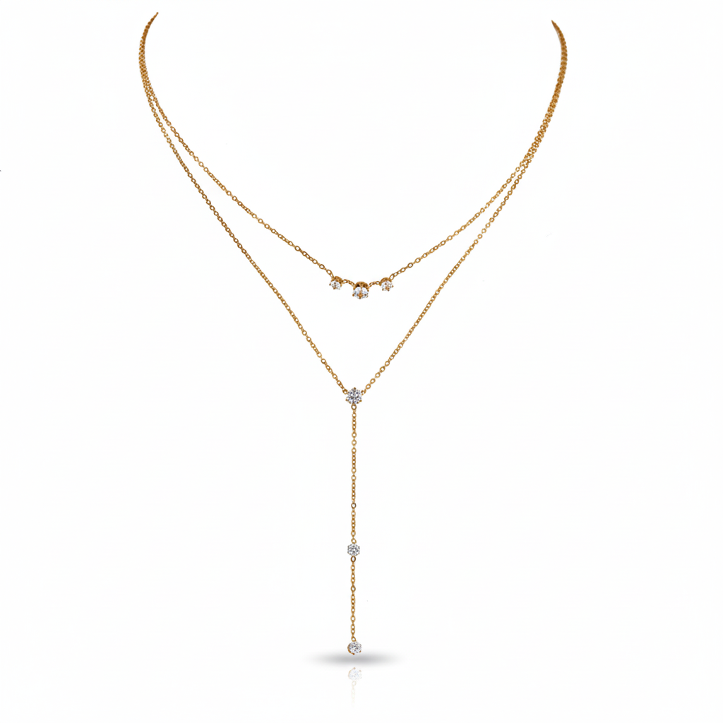 Crafted from premium gold-plated metal, this layered necklace features two delicate chains adorned with hand-set cubic zirconia stones that shimmer with every movement. The upper chain highlights a trio of sparkling gems, while the longer drop chain elongates the neckline, adding a touch of graceful sophistication.